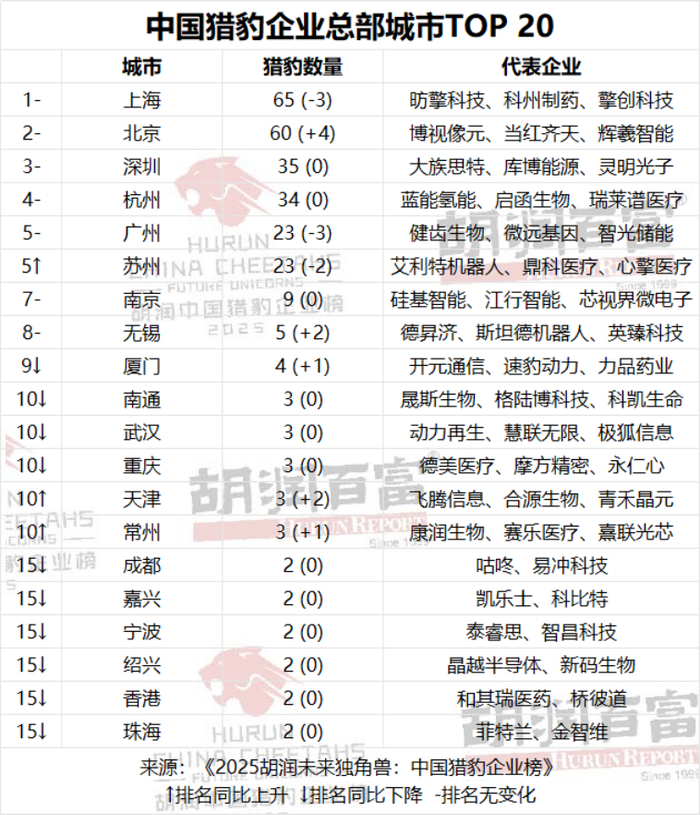 从上榜企业所在城市来看,长三角地区,以上海、杭州、苏州为首,表现突出,占据全国“胡润猎豹企业”总数的半壁江山。