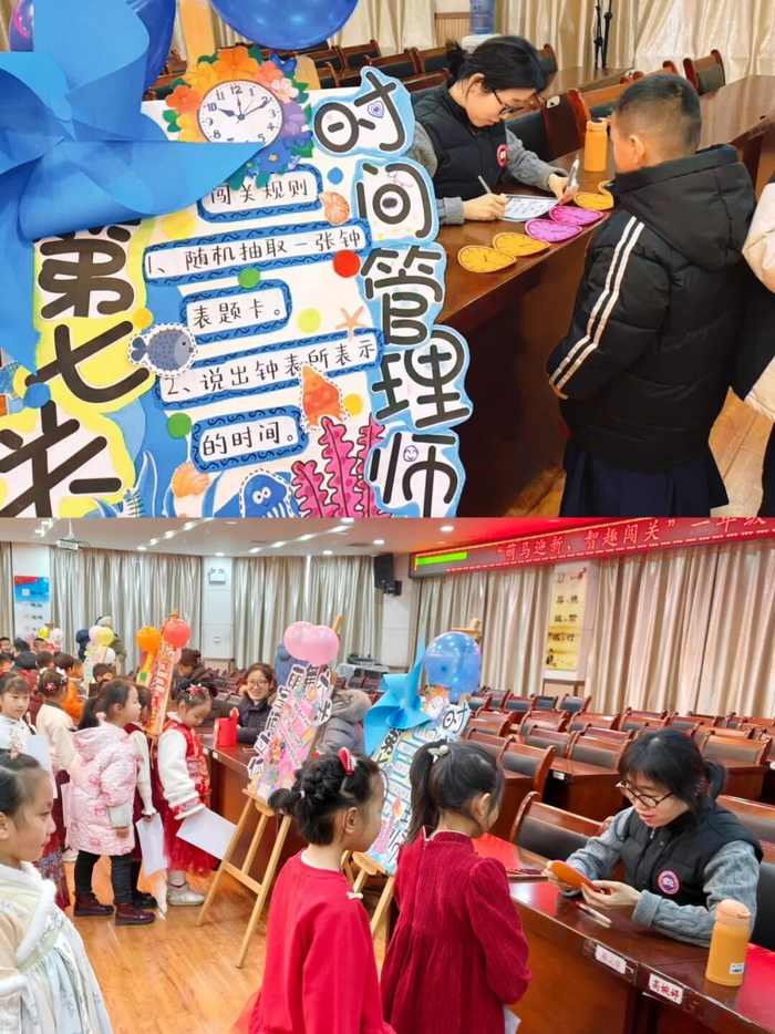 第七关“时间管理师”考验着孩子们的动手与认知能力。学生们抽取卡片后,在钟表学具上认真辨别时针和分针,并认读整时和半时,孩子们专注的神情,体现了对时间知识的灵活运用。