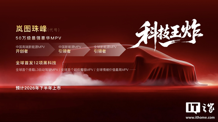 岚图珠峰(代号)定位 50 万级最强豪华 MPV,全球首发 12 项黑科技,包括:全球首个搭载 L3 自动驾驶 MPV、全球首个超级魔毯 MPV、全球情绪价值最高 MPV 等,预计 2026 年下半年上市。