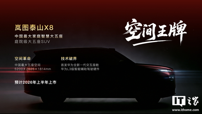 岚图泰山 X8 宣称将成为“中国最大家庭智慧大五座庭院级大五座 SUV”,尺寸为 5200×2025×1814mm,将首发华为全新一代交互座舱、华为 L3 级智能辅助驾驶硬件,预计 2026 年上半年上市。