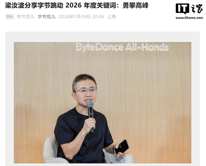 IT之家 1 月 29 日消息,今日,字节跳动官方账号“字节范儿”披露了该公司当日召开的 2026 年首次全员会议部分内容。公司 CEO 梁汝波在会上表示,字节跳动将 2026 年的关键词设定为“勇攀高峰”。