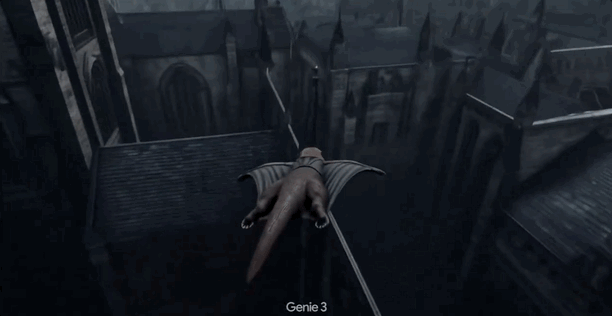 「Genie 3 在建模和物理模拟方面是一个巨大的飞跃,但仍存在一些待解决的问题,比如一只头顶着鸭子的水獭飞行员正走在一家罗斯科(Rothko)风格的机场里;以及一只穿着翼装的水獭正飞越一座充满哥特式塔楼的城市。」