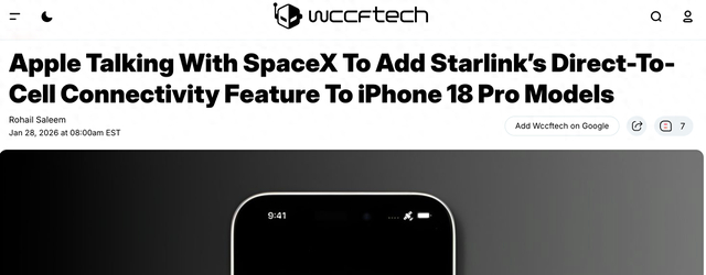 【环球网科技综合报道】1月30日消息,据Wccftech报道,苹果公司正与SpaceX深入谈判,计划在其即将发布的iPhone 18 Pro系列机型中引入星链(Starlink)近地轨道卫星网络,实现用户无需额外硬件即可直接连接蜂窝网络的功能。